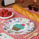Set of eight 9” paper plates with an image of whimsical cupcakes on pink behind a white centre with a turquoise border and an image of a chocolate cupcake with teal icing topped with a red heart. See matching candy jar, espresso cup, pitcher, teapot and coasters. See the entire Kids' Corner Plate collection in the FOOD/BEV | Dishes section.