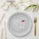 This elegant Valentine's Day paper plate features a striking white typography design of Happy Valentine's Day accented by a tiny cupid and red hearts on a soft grey striped background. A lacy white border completes this unique design. The background is optional and can be deleted to select an alternate colour if preferred. Search ID736 to see other products with this design.