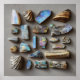 An appealing arrangement showcasing a diverse collection of smaller opalised fossils, such as tiny shells, belemnites, or fragments of bone. Each piece, though small, exhibits unique opalisation and flashes of colour, presented together as a curated display of ancient, iridescent treasures, perfect for a natural history enthusiast.