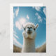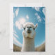 A charming alpaca peers curiously into the camera, captured in a fun fisheye perspective. The bright blue sky and soft clouds make for a delightful backdrop, while the sun shines overhead, adding a cheerful glow to this adorable scene.