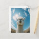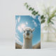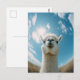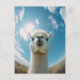 A charming alpaca peers curiously into the camera, captured in a fun fisheye perspective. The bright blue sky and soft clouds make for a delightful backdrop, while the sun shines overhead, adding a cheerful glow to this adorable scene.