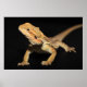 A curious bearded dragon looking forward in front of a black background.
