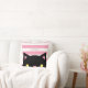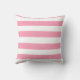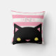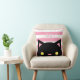 Super cute throw pillow with a black cat peering up on you in front of a background of broad pink and white stripes.