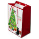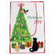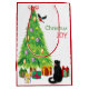 On each side of this Holiday gift bag, a curious black cat sits beside a Holiday tree, and watches as a bullfinch lands on it. Brightly wrapped gift packages are scattered about. The red and green text says "Christmas JOY". Cute!