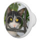 A cute bicolor piebald cat is looking attentively through a wrought iron fence, it seems as though she wears glasses frames. This ceramic knob for decorating furniture is a gift idea for pet and cat lovers. Photo taken by Katho Menden on a Greek islands. http://www.zazzle.com/kathom_photo