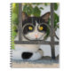 A cute bicolor piebald cat is looking attentively through a wrought iron fence, it seems as though she wears glasses frames. This photo cover journal notebook with spiral binding is a gift idea for pet and cat lovers. Photo taken by Katho Menden on a Greek islands. http://www.zazzle.com/kathom_photo