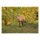 A curious young fox calmly peers from a grassy hill with a background of autumn colour.