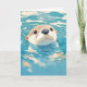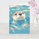This image features an adorable otter swimming in a serene pool of water. The otter looks content and curious, with its head above the waterline, gazing upwards. The surrounding water reflects soft blues and whites, adding a calming atmosphere to the scene. The ripples in the water emphasize the otter's movement, making this a peaceful and captivating image of nature and wildlife.