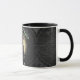Curious pirate cat deciphers ancient mysteries Mug: A black cat dressed as a pirate deciphers an ancient document against a retro sunset.