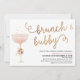 Simple and sweet brunch bubbly bridal shower invitation featuring a faux gold curly calligraphy heading, blush champagne glass and a small boho floral arrangement. The color on the back can be altered.