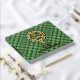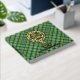 Clan Currie rooster crest badge surrounded by a strap and buckle over tartan background. Custom front, back and spine text.