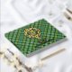 Clan Currie lion crest badge surrounded by a strap and buckle over tartan background. Custom front, back and spine text.