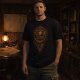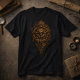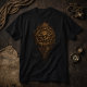 Designed specifically for fabric, the coin is tightly cropped and vertically weighted, with a restrained ash-and-dust falloff that keeps the mark grounded on the shirt instead of floating. The aged brass tones and ink-dark relief give the impression of something stamped, not printed—claimed rather than displayed.