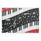 Contemporary curved piano keys and white musical notes with contrasting red and black panels