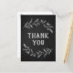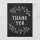 This curved branches chalkboard thank you postcard is perfect for a modern wedding. The black and white floral design features two chalk drawn branches arranged to compose a rustic leafy wreath. Personalise the back of the postcard with your names, your return address, and a thank you message. Alternatively, leave the thank you message template section blank to hand write a thoughtful personalised note on each card after they arrive. These cards can be used for a wedding, bridal shower, or any special event.