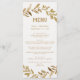 This curved branches gold dinner menu card is perfect for a modern wedding. The classic design features two metallic faux gold foil branches arranged to compose an elegant leafy wreath. This menu can be used for a wedding reception, rehearsal dinner, or any event.