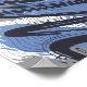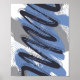 The artwork is an abstract composition featuring bold black brushstrokes arranged in slanted, curved repetitions, resembling flowing waves or large connected letters. Behind these strokes, irregular patches of blue and grey create layered depth, while thin curved lines in black and grey spread across the white background. The overall impression conveys dynamic movement and a sense of continuous energy, as if symbolising crashing waves or powerful flowing forces in an abstract form.