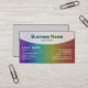 A business card template with a semi-transparent curved header area for the company name and business type etc, with name, job title and other contact details in the section below. The reverse side of the card has been left blank although the base colour is derived using a semi-transparent white image so it matches the semi-transparent header on the front. This can be left blank which is useful for writing notes or can be further customised and/or used for additional text/graphics. This version also has a semi-transparent white texture overlay on both the front and back and a semi-transparent rainbow image on the front which creates the dark rainbow colour variation.