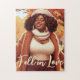 Embrace the warmth of autumn with our Fall Bliss jigsaw puzzle, featuring a charming illustration of a beautiful African American curvy woman in fashionable fall attire, joyfully playing in the leaves against an autumn tree background. This elegant design boasts a Fall colour scheme, capturing the essence of the season. Add your own custom text to the bottom for a personalised touch. Perfect for Thanksgiving activity or any fall celebration, this ©2023 Miss Sassy Party Designs brings you the epitome of autumn elegance for your thoughtful gestures