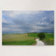 Jigsaw puzzle of a winding 'strada bianca' dirt road with many curves through the green fields in a landscape in Tuscany with a tree along the path and beautiful clouds in the sky leading to a destination in the distance. An analogy to the curvy life path under the dark clouds of threats during life.