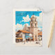 A beautifully illustrated travel postcard of Cusco, peru, showcasing the iconic Plaza de Armas with its stunning colonial architecture, cobblestone streets, and lively atmosphere. The centerpiece is a historic stone church with an intricate bell tower, surrounded by charming buildings with wooden balconies and colourful awnings. Bright blue skies, scattered clouds, and bustling street life bring the scene to life, evoking the spirit of this world heritage city.