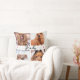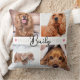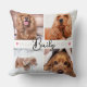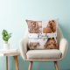 Beautiful photo collage pet dog, cat or rabbit loss pillow to honour the life of your furry friend. Front: It displays a 4 pictures along with the text "in loving memory" in grey capital font, decorated with pink hearts, and your pet's name in script typography. Back: 4 pictures with the message "you have left paw prints on our hearts that will last a lifetime".