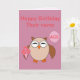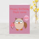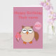 This fun Birthday card features a cute brown owl with big sleepy eyes. The owl is holding a pretty pale pink balloon and a bouquet of bright pink flowers wrapped in a pale pink cone.