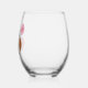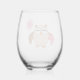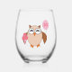 This awesome stemless wine glass features a cute brown owl with big sleepy eyes. The owl is holding a pretty pale pink balloon and a bouquet of bright pink flowers wrapped in a pale pink cone.