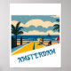 A vibrant and colourful illustration of a beach scene in Amsterdam, Netherlands. The image features a sandy beach with colourful umbrellas, palm trees, and a boardwalk leading towards the ocean. A sailboat is visible in the distance, and the sky is filled with fluffy white clouds. The overall atmosphere is cheerful and inviting.