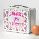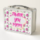 This is a standard metal lunchbox that appears to work just fine. We designed this box ourselves with an uploaded photo and custom text on the front and back. It looks absolutely beautiful except the front of the lunchbox is not centered like it shows in the photo. The print borders don't align with the inset flat part of the box where the preview photo online showed it perfectly centered in there. The back looks nice and centered though.