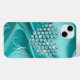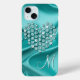 A contemporary image of a faux shiny diamonds heart on a bright aqua turquoise blue green coloured printed image of wavy satin fabric. With room to customise or personalise with a monogram of your choice. Beautiful, modern, and cool cover for the trend-savvy and art-loving hip trendsetter, artsy motif lover who wants to protect their phone from dust and dirt, wear and tear. This design is available in Apple iPhone 6, 7, and 8 Plus, 10 or X, XR, XS, 11, 12, 13 Mini, 14, 15 Plus, and Pro Max cellphone cases. Show off your style, look fashionable trendy, and feel stylish with a unique design on a mobile device accessory of your choice.