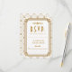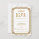 These RSVP response cards feature a white and gold colour palette, a geometric frame, geometric patterns, and other stylistic details all inspired by Art Deco and the roaring twenties. You can customise the sample text fields to your liking.