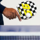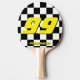 Custom auto racing theme ping pong paddle for table tennis. Personalised name and number or monogram ping pong paddle for table tennis Sports game gift idea for men women and kids. Monogrammed letter initial design. Custom background colour. Fun for player and school coach. College dorm accessoiries. Yellow and chequered flag design with race car number. Fun birthday party gift for boys.