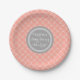 Customisable name it's a girl baby shower party plates in fun and chic peach orange pink, grey and white Moroccan quatrefoil lattice pattern.