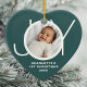 This stylish heart-shaped Baby's First Christmas Photo Ornament is decorated with the word JOY on a green background.