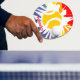 Yellow tennis ball ping pong paddle for table tennis. Colourful dynamic novelty design with ball breaking through hole. Personalised name or monogram ping pong paddle for table tennis