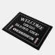 Custom barber shop doormat with red and blue barber pole sign. Personalise with your own business / company name. Black and white door mat.