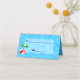 Custom place cards with beach balls, pool umbrellas and other tanning essentials with a retro font on a wavy ocean blue background