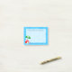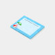 Custom Post-it notes with retro letters and fun beach or swimming pool themed art of a red beach ball, green sun umbrella, vacation sandals and suntan oil on a watery blue background.
