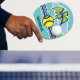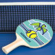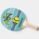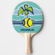 Yellow beach ball ping pong paddle for table tennis. Cute design symbolising a tropical palm tree island with clouds. Personalised name or monogram ping pong paddle for table tennis