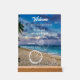 This modern and stylish acrylic pedestal sign features 'Welcome - to our beach house. You can add your favorite photo. This is perfect gift idea. Personalize with your name and other text. It can be personalized or customized with your own message. It's a simple, welcoming method for informing your vacation rental guests about the internet login details.
