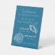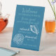 Modern yet elegant polystyrene pedestal sign with teal blue coloured 'Welcome - to our beach house - be our guest and enjoy free wifi - network: - password: - enjoy your stay' text on a chic white background. To personalise or customise with your own text. A simple and friendly way to let your vacation rental guests know how to log-in and use the internet.