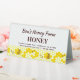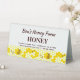 A custom small business honey table tent sign with large text on top for your business name and product, and smaller text on the bottom for your address or other info, and vintage art of honey bees on a honeycomb. Customise it to change fonts, background colours, upload your logo, even save your design for later.