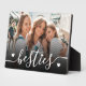 Create a custom keepsake with this personalised photo home decor display. The front features your favourite photo with the word "besties" written across the bottom in a flowing script font, accented by a few small heart details. A subtle black gradient sits behind the text to help it stand out without overpowering the image.