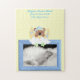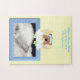 A cute puzzle with a pale yellow background, sky blue words, sky blue picture frame, and an adorable bear with a blue night time hat, on a yellow moon with clouds and stars. Fully custom other than the frame and bear. This would be such a cute way to tell your loved ones about the new baby and thank them for their baby shower presents.