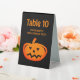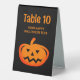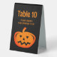 Custom black and orange Halloween party Table Tent Sign. Fun black and orange design with spooky pumpkin head carving. Personalise with your own custom text.