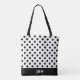 This black-and-white tote bag has a modern polka dot pattern. At the bottom of the bag, there is a black band that you can use to customise the bag with your initials/text.