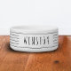 Custom black and white modern minimal farmhouse style thin multiple stripe pet food or water bowl with your cat or dog name printed on the side. Use the advanced template editor to change font, background or stripe colours to match your decor or favourite colours.
