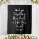 Black and white wedding backdrop with the quote "and so together they built a life they loved". Ceremony or reception party decor personalised with the couple's names and the event date.