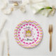 Blonde Princess 3rd Birthday paper plates features a little princess with blonde hair wearing a golden jewelled tiara surrounded by pink flowers, text that reads I'm 3 Today, a border of chevron stripes of hot pink, light pink, gold, and white, and an area you can personalise with her name! The third princess birthday party will be off to a great start with these colourful princess paper plates. Look for the matching napkins, T-shirts, buttons, bags, and more!